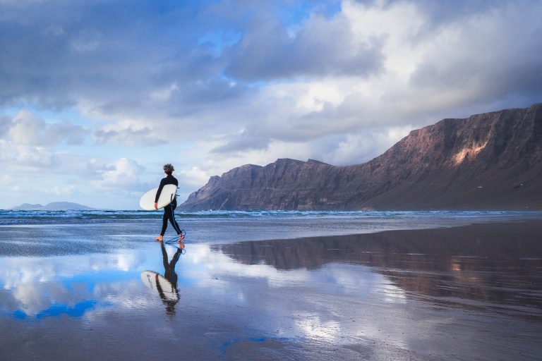 Viajar en furgoneta camper por Lanzarote es sinónimo de libertad. Y si hay un lugar donde esta sensación alcanza su máximo esplendor, ese es la playa de Famara, uno de los enclaves más espectaculares de la isla. Kilómetros de arena dorada, el imponente Risco de Famara como telón de fondo y el Atlántico abierto ofreciendo olas perfectas para surfistas de todos los niveles.